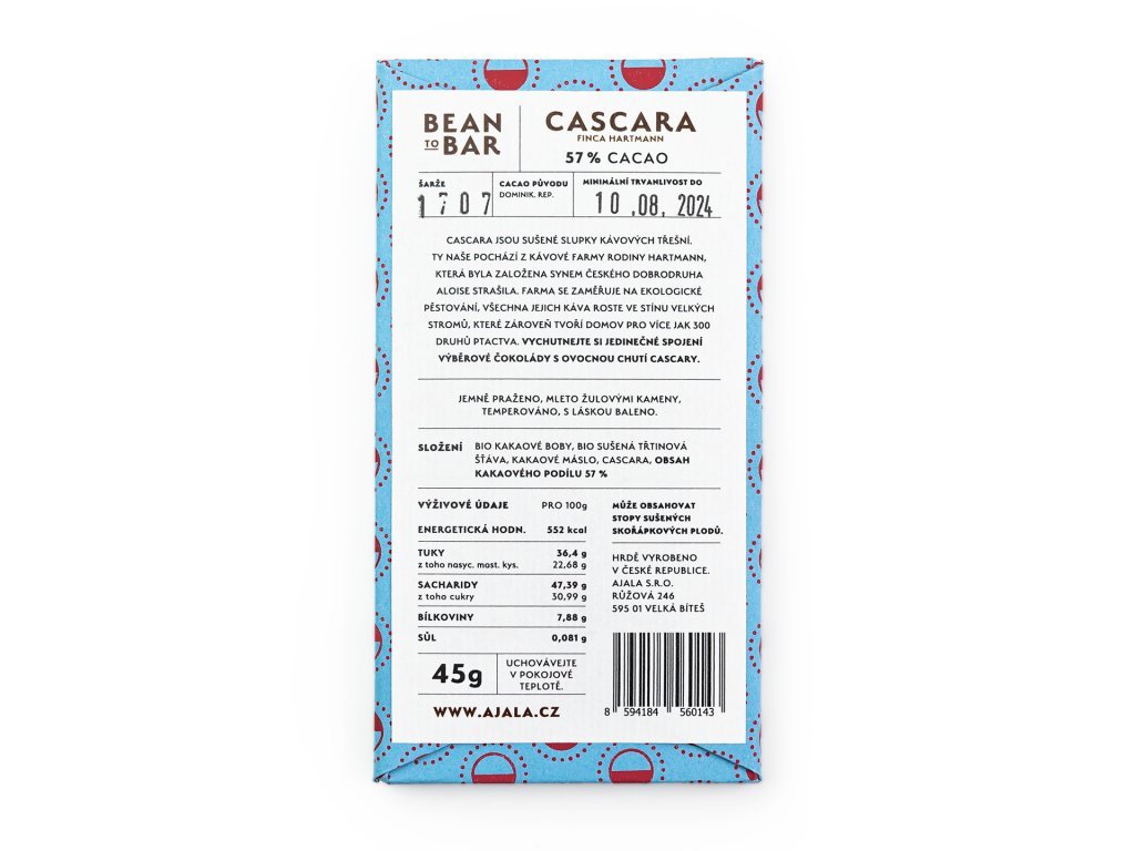 - Složení: bio kakaové boby, bio sušená třtinová šťáva, bio kakaové máslo, cascara