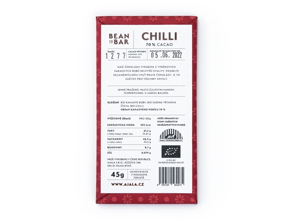 - Složení: bio kakaové boby, bio sušená třtinová šťáva, bio chilli