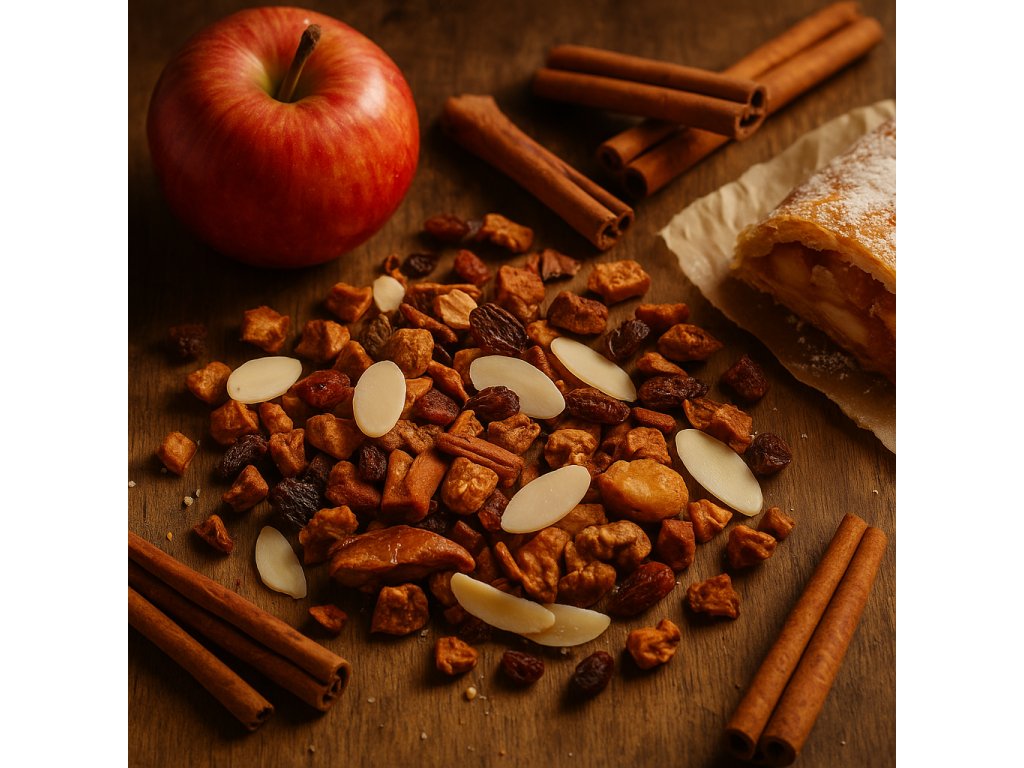Obsahuje: | Kousky jablek, Mandlové lupínky, Plátky jablek, Pražený čekankový kořen, Rozinky, Skořice, Vanilka |