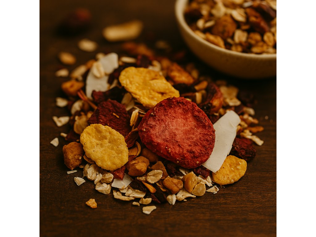 Obsahuje: | Bezlepkové kukuřičné lupínky, Bezlepkové ovesné vločky, Červená řepa, Kokosové lupínky, Kousky jablek, Květy ibišku, Lískové ořechy, Lusky fazole, Plátky jahod |