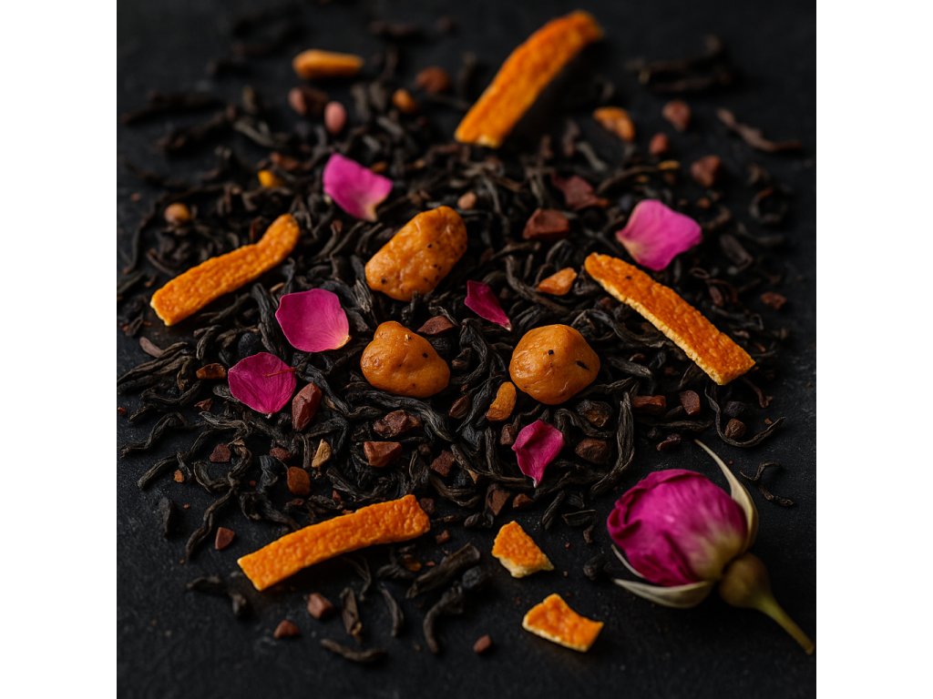 Obsahuje: | Kakaové kúsky, Kôra z pomaranča, Okvetné lístky ruže, Pražené mandle v karamelovom obale, Strúhaný kokos |