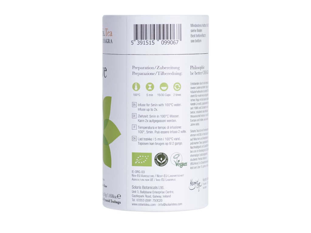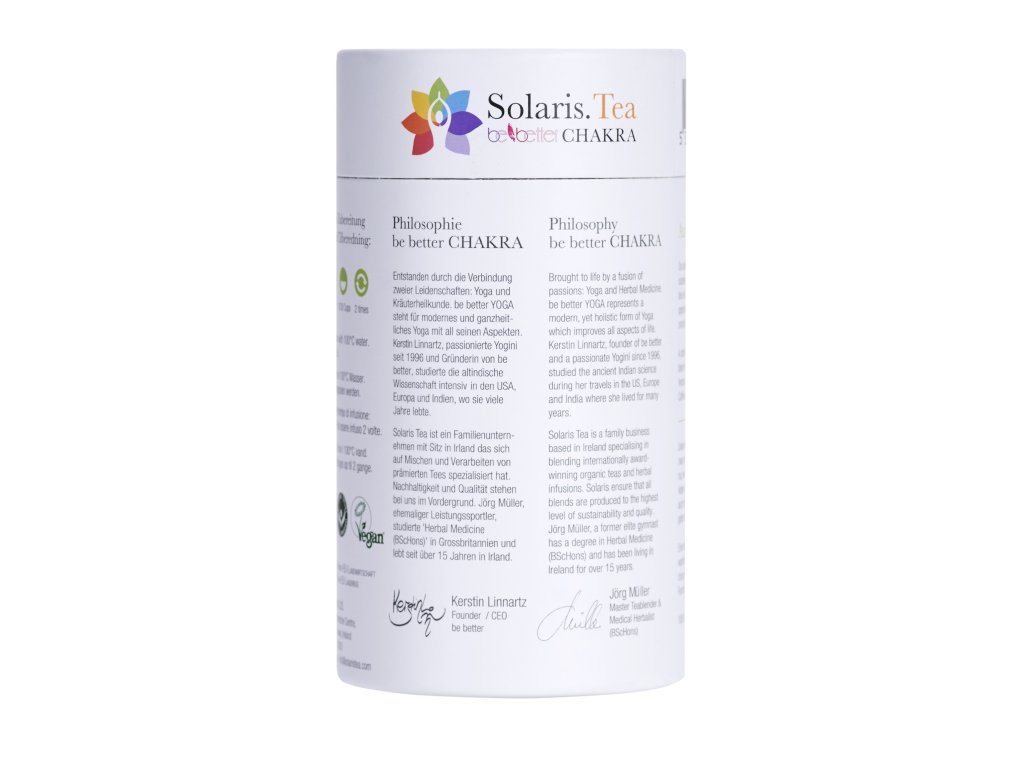 Solaris Botanicals Ltd. je rodinná značka z Írska, ktorá sa špecializuje na ručne miešané organické čaje a bylinné zmesi. Kolekcia be better CHAKRA vznikla v spolupráci s jogínkou Kerstin Linnartz a prepája múdrosť jogy, byliniek a vedomého života do jedinečnej čajovej cesty k sebe.