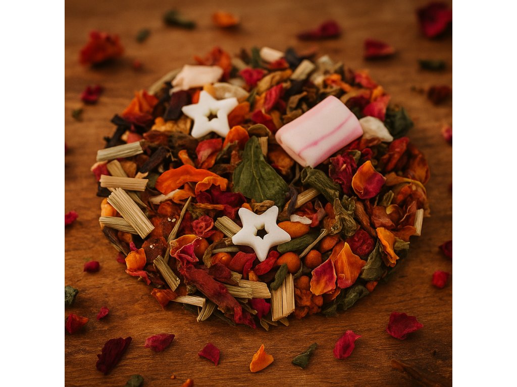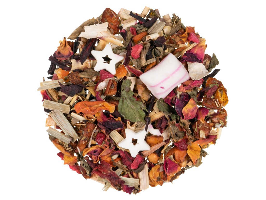 Obsahuje: | Citronová tráva, Kousky jablek, Květy ibišku, Lusky fazole, Okvětní lístky růže, Stévie, Přírodní aroma, Mátové bonbony, Bílé cukrové hvězdy, Kousky mrkve, Máta nana, Kousky malín |